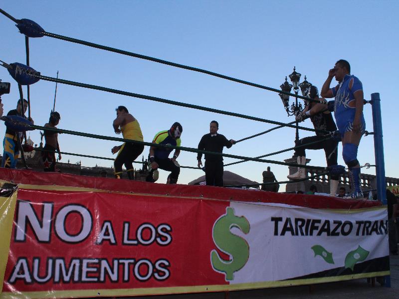 Monterrey, México.- Para invitar al ciudadano a sumarse a la exigencia de que en este 2019 la autoridad estatal no apruebe incrementos a la tarifa del transporte urbano en la zona metropolitana de Monterrey, integrantes de diferentes Organizaciones No Gubernamentales realizaron ayer una función de lucha libre donde "Súper Usuario" buscaba derrotar a "Tarifazo".