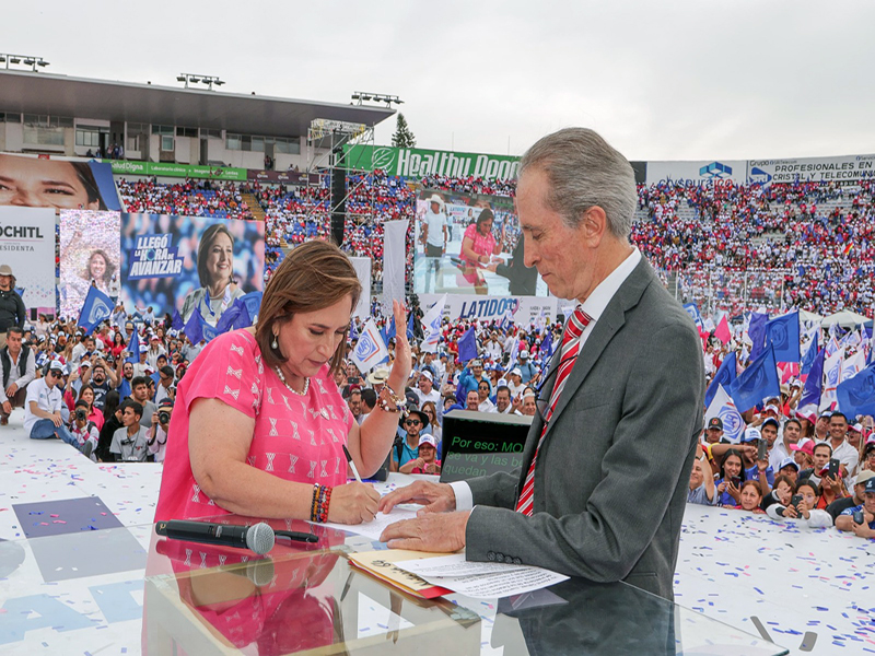 Gálvez Ruiz, firmó ante el notario público, José Luis Arredondo Ramírez, su compromiso de mantener e incrementar los programas sociales teniendo de testigos a simpatizantes que acudieron al estadio Sergio León Chávez, donde propusó que la pensión para adultos mayores sea un derecho a partir de los 60 años, con el fin de apoyar a mujeres y hombres de zonas marginadas del país.